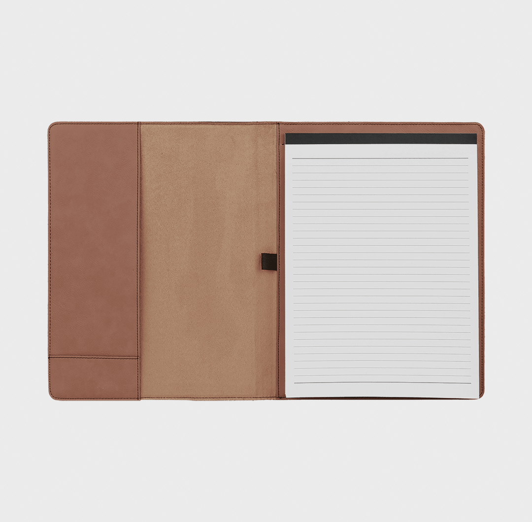 With a smooth, professional finish and clean stitched edges, our leatherette portfolio brings structure to your notes and thoughtful planning. Open the cover to reveal a 50-page lined notepad (replaceable) and a loop for your writing utensil of choice.